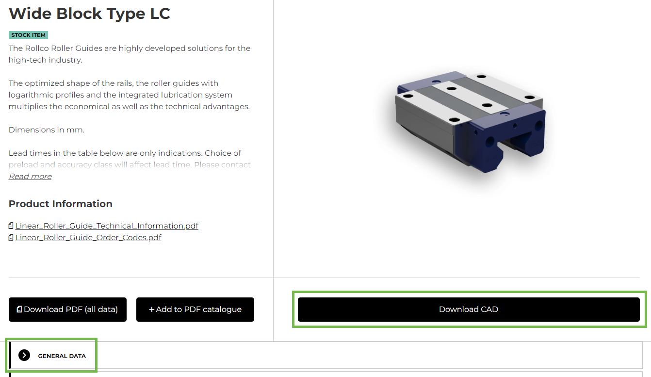 Välj produktkategori i högerspalten och navigera vidare till produkten. Klicka på knappen Download CAD eller på en av flikarna under produkten (General Data i exemplet nedan).